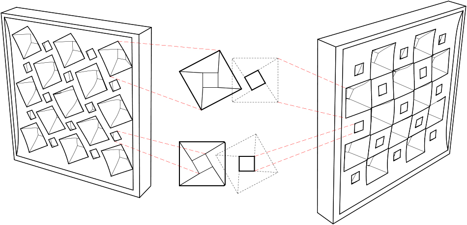 This project was set out to play with the effects of light passing through high density foam material. We used a large CNC mill to mill out a pattern of nested torqued tunnels of light. A square geometry is twisted 45 degrees as it is extruded from the base foam. This is done on both sides, but with a 45 degree difference. The light result is a simple checkerboard pattern of square light on one side and a rotated checkerboard on the other. The torqued geometries allows light to be transmitted not only through the thin end plane, but also through the edges of each tunnel. |
